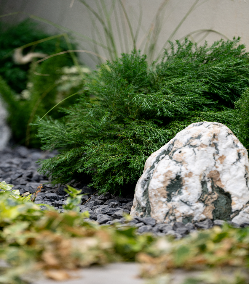 This Zen-inspired retreat by Abundance Landscape blends bonsai, carpet grass, natural rocks, and stepping stones, creating a serene outdoor sanctuary for relaxation and contemplation